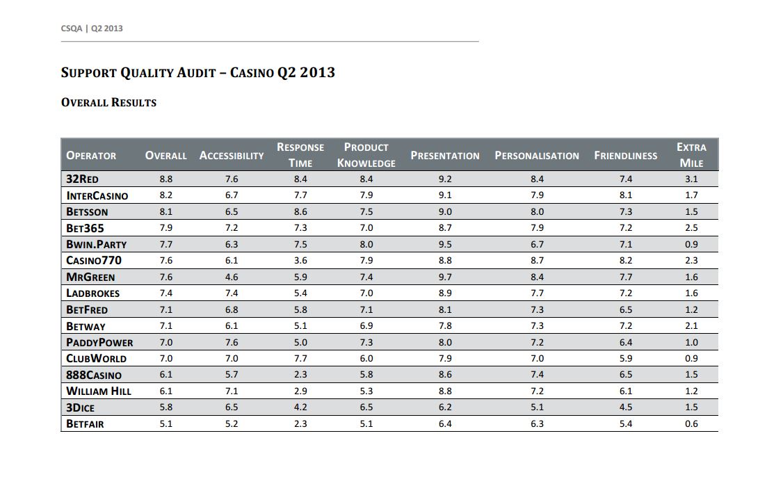 32 Red Casino e numarul 1 in acest clasament al relatiei cu jucatorii de caznouri online cu un punctaj de 8,8. Pe locul 2 a iesit InterCasino cu un punctaj de 8,2, pe 3 a fost Betsson cu 8,1 iar pe 4 cei care lucreaza la bet365 casino cu un punctaj de 7,9.