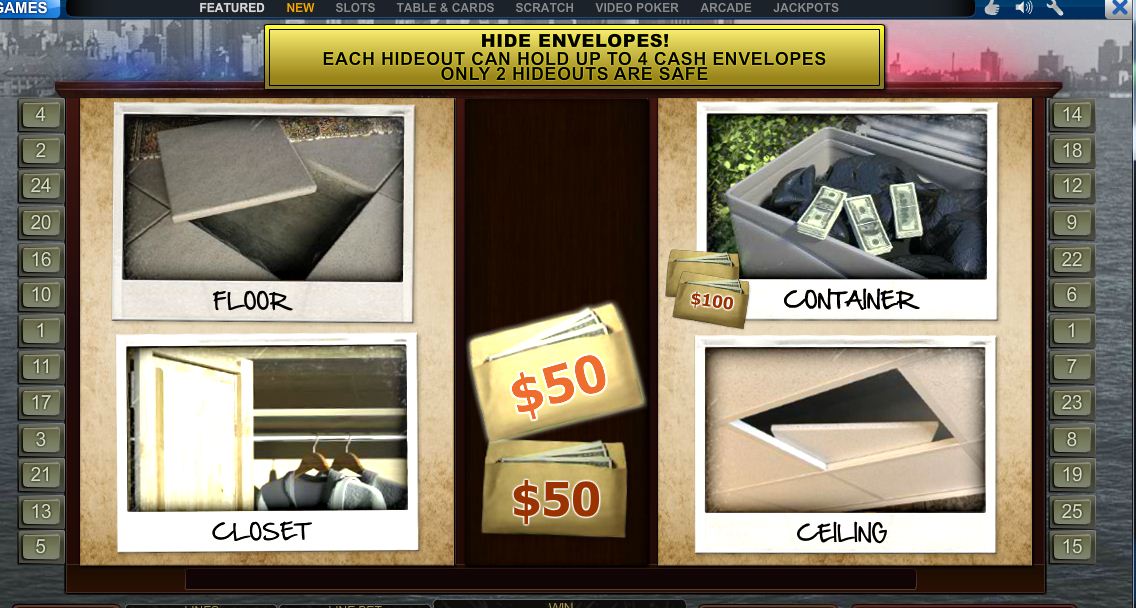 Are multe bonusuri dar preferatul meu este Raid Bonus care nu se sfieste sa apara des si e interesant. Vi se dau 4 plicuri cu bani,fiecare cu valoarea mizei duble pe un spin si vi se cere sa le ascundeti de politistii de la crima organizata in 4 locatii distincte.Puteti sa alegeti sa puneti fiecare plic in cate o locatie si astfel cand vine masina FBi-ului va descoperi doar 2.In felul asta castigati sigur ceva.